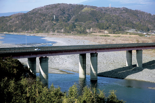 いまでも富士川の河口の幅は日本一の1,950mを誇ります。広い河口域からは遮るものがないため、富士山の雄大な姿を眺められます。また多くのダムがつくられ、流量が調整され、砂防工事によって河川への土砂流出が押さえられています。そのため、昔のように、洪水の危険にさらされることは少なくなりました。ところが富士川河口の沿岸部へ土砂が流出されなくなると、浸食された海岸線が後退するというあらたな問題が発生しました。 |