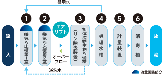 | 流量調整型・嫌気ろ床・担体流動生物ろ過循環方式に リン除去装置を加えた方式 |